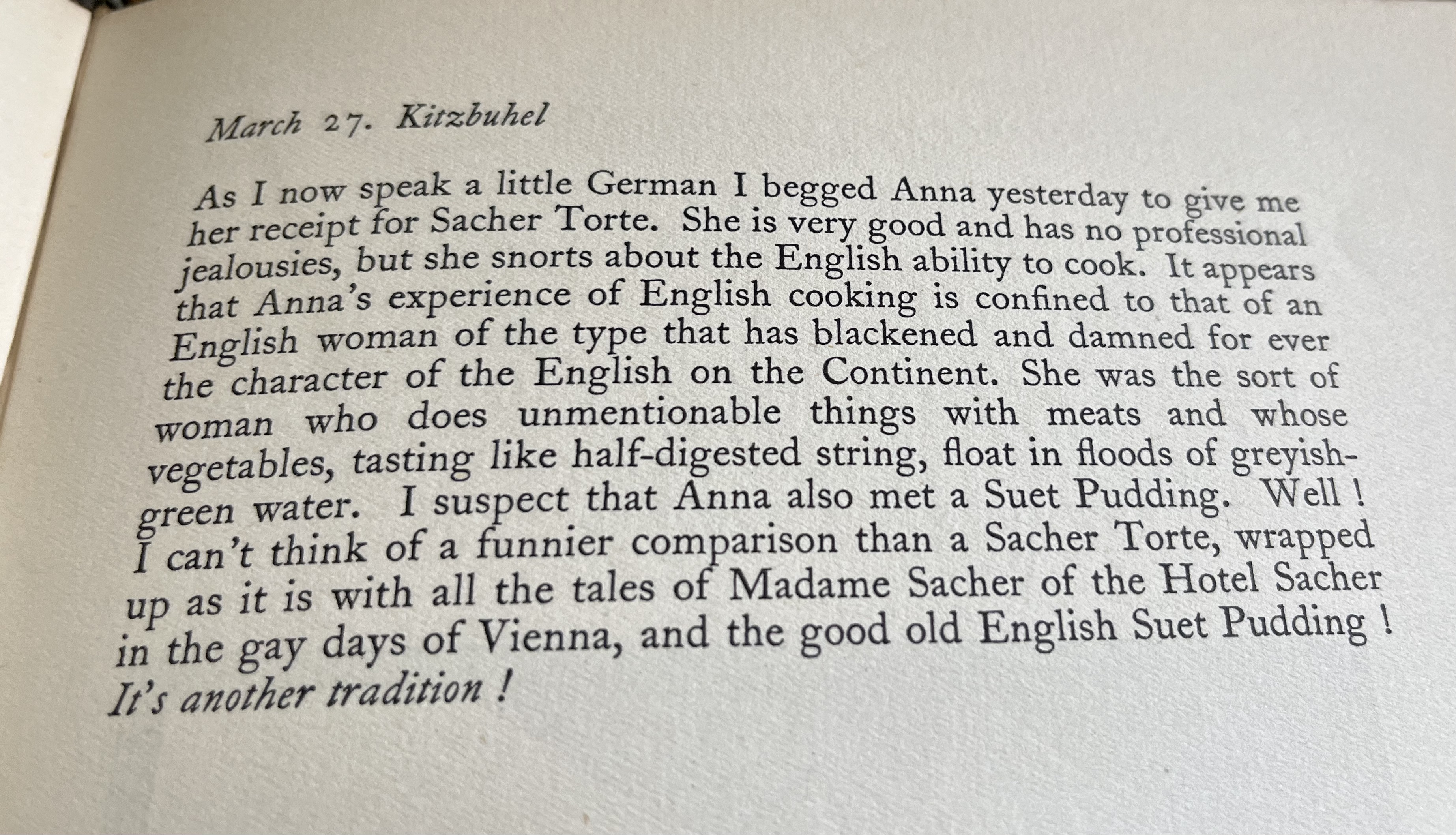 And it must be said, though he is not complimentary about all Austrian cooking, he is later equally willing to report the disdain of Anna for, as he described, the type of English cook who has ‘damned forever the character of the English on the Continent’ by their appalling cooking.